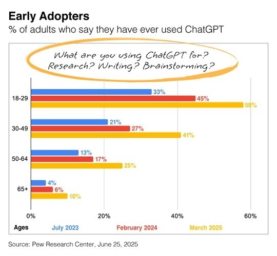The chart below shows that 18-29 have embraced ChatGPT (an AI chatbot) faster than any other age group. But what caught our attention was the 65+ numbers! They’ve seen a big increase in users - a 150 percent increase from 4 percent to 10 percent in less than two years. Older Americans are showing they don’t want to be left behind.