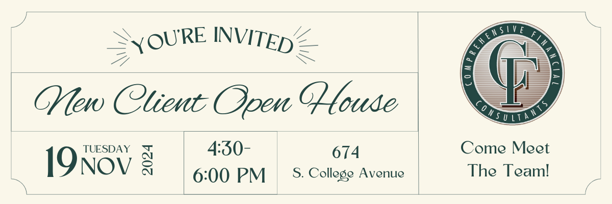 This open house is exclusive to new clients of Comprehensive Financial Consultants in the last 18 months. Space is limited, and we ask for your RSVP by Thursday, November 14.